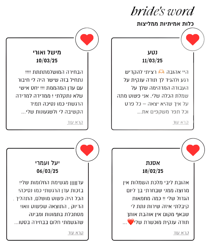 לכן, השליחות שלי זה לדאוג שביום שלך תרגישי הכי מיוחדת מבלי לחרוג מהתקציב ולא משנה במה תבחרי – בין אם זו תפירה מאפס או השכרה ממלאי קיים.